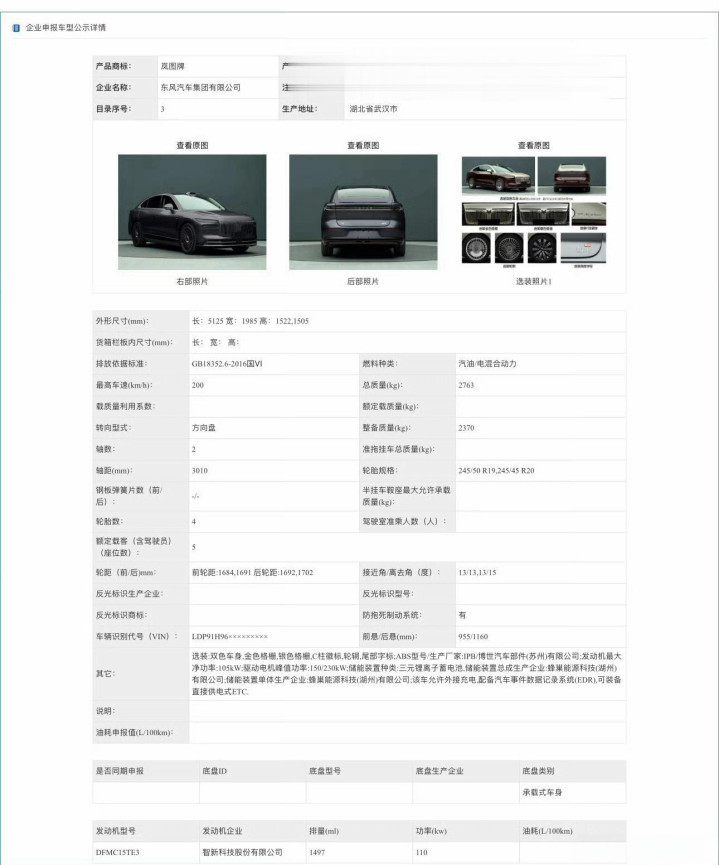 至于动力总成,除了搭载蜂巢能源三元锂电池,据说容量会扩大到63kWh。岚图提供给新追光依然是基于1.5T发动机和前后电机组成的四驱插混系统。发动机申报最大功率是110kW,比现款版本高10kW,从型号来看应该是在原有基础进行升级。前后电机分别有150kW和230kW,相比现款130kW、160kW的组合,强化更为明显。考虑到新追光的整备质量2370kg,增加了125kg,所以零百加速性能肯定会在5.9秒基础上有提升,不过极速依然锁定在200km/h,放在同级车型中没有优势。