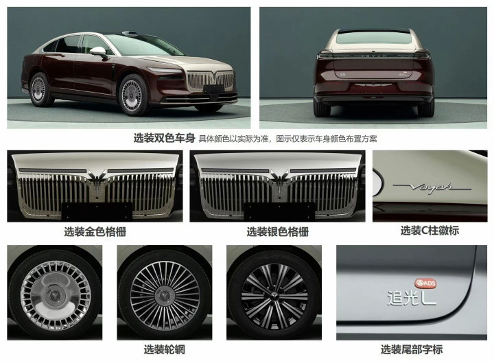 更有趣的还得看选装,双色车身的“追光L”没有用迈巴赫从腰线改色的样式,而是更贴近宾利、劳斯莱斯的感觉,只对前后盖和侧顶进行涂装,克制中也凸显了品味。岚图给新追光提供了两款多幅样式轮毂,以及复古必备的“大饼”轮毂,俨然就是岚图版的尊界S800。